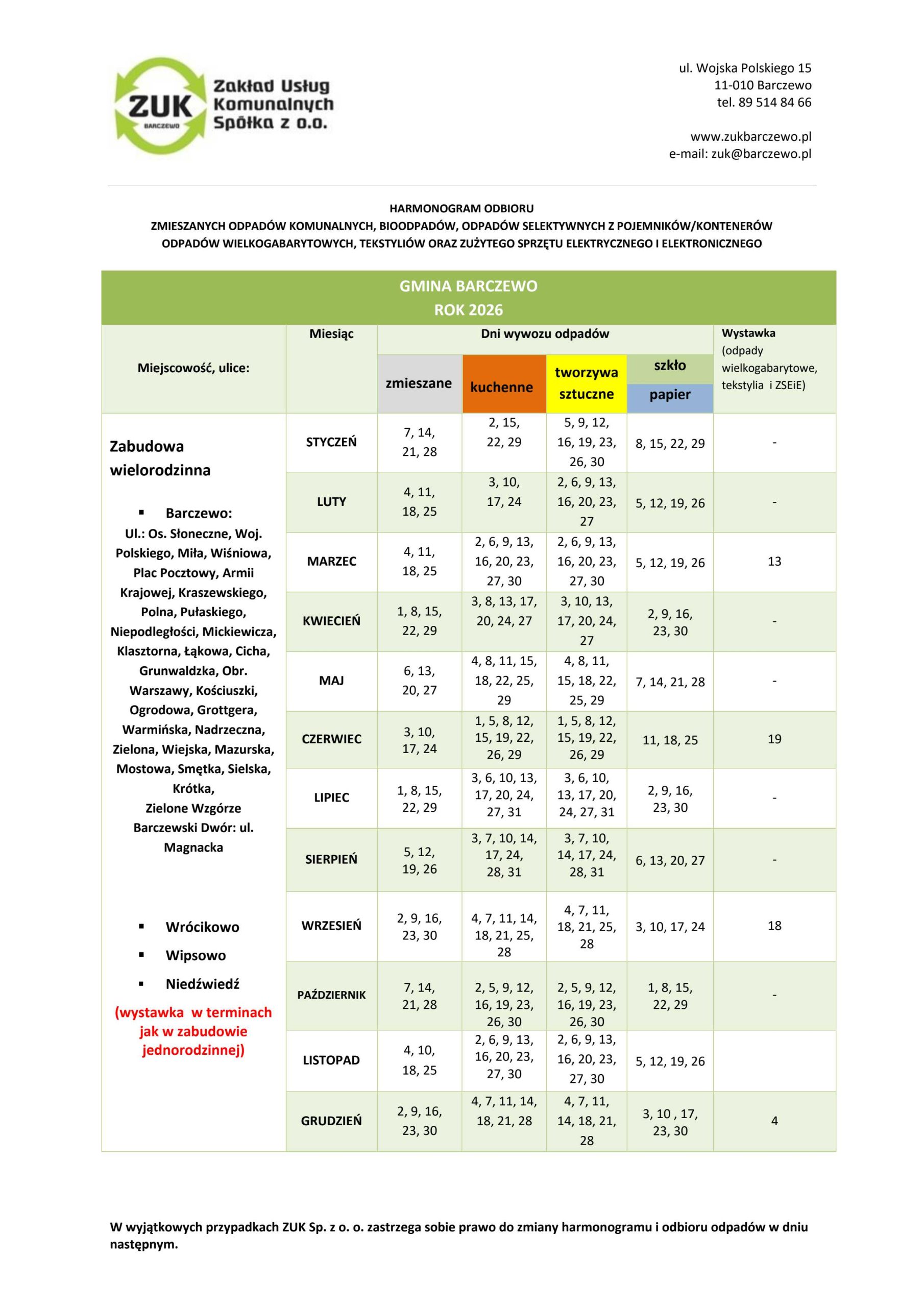 Poniżej przedstawiamy harmonogram odbioru odpadów komunalnych na rok 2026. W wyjąkowych przypadkach ZUK Sp. z o.o. zastrzega sobie prawa do zmiany harmonogramu i odbioru odpadów w dniu następnym.